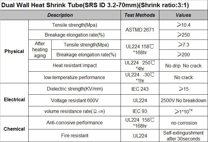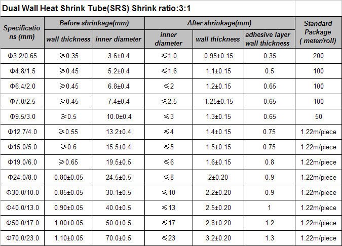 Description:the outer wall is made of crosslinking polyolefin and with inner wall of hot melt adhesive. Suitable for electrical applications where good longitudinal water tighness is needed.High shrink ratio( 3:1 4:1)